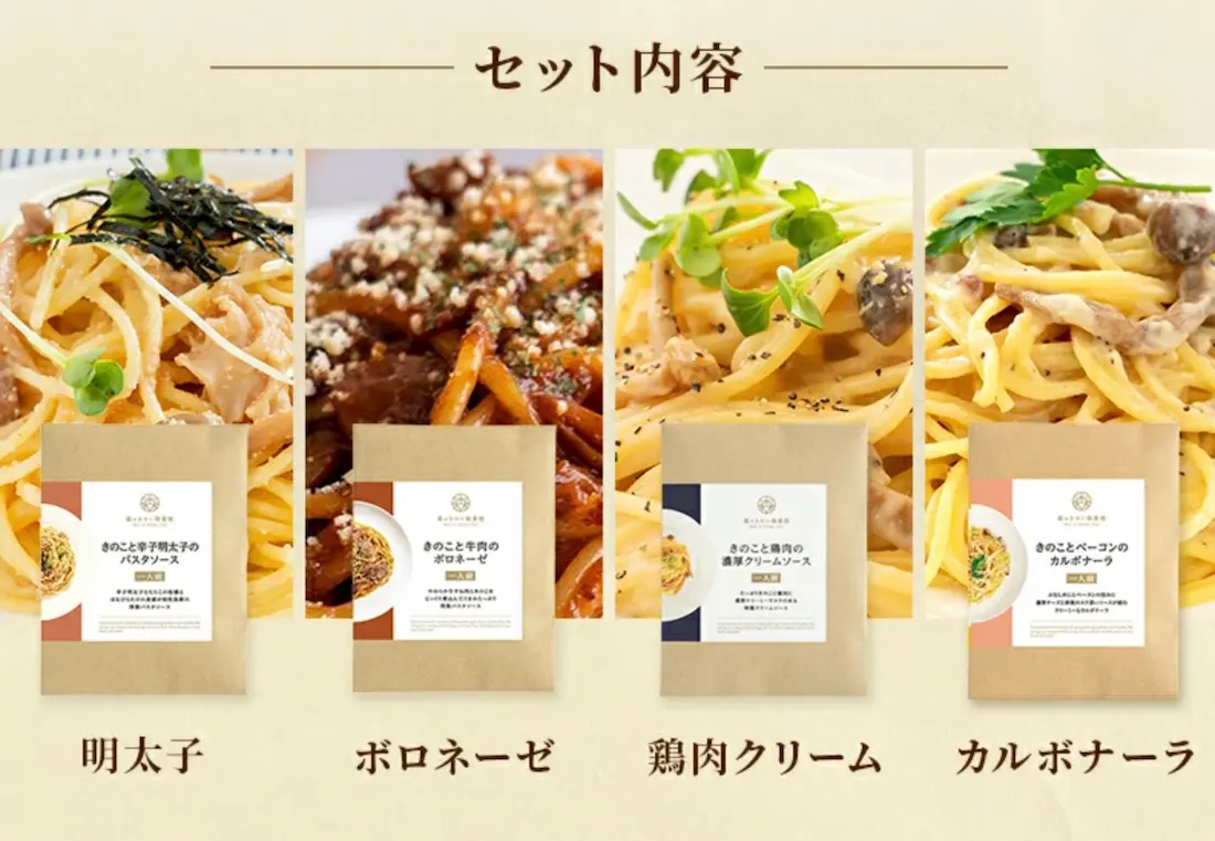 | 内容量 | 明太子、ボロネーゼ、鶏肉クリーム、カルボナーラ |